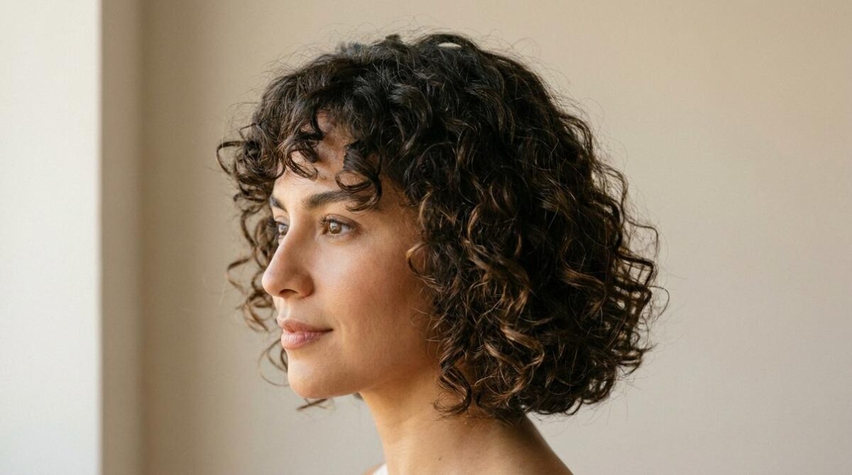 El fleco agrega personalidad sin comprometer la definición. La clave está en que sea lateral y despuntado, nunca recto ni muy tupido. Esto evita que se encrespe por separado del resto del cabello. Aplica gel o mousse específica para rizos solo en esta sección para mantenerlo en su lugar.